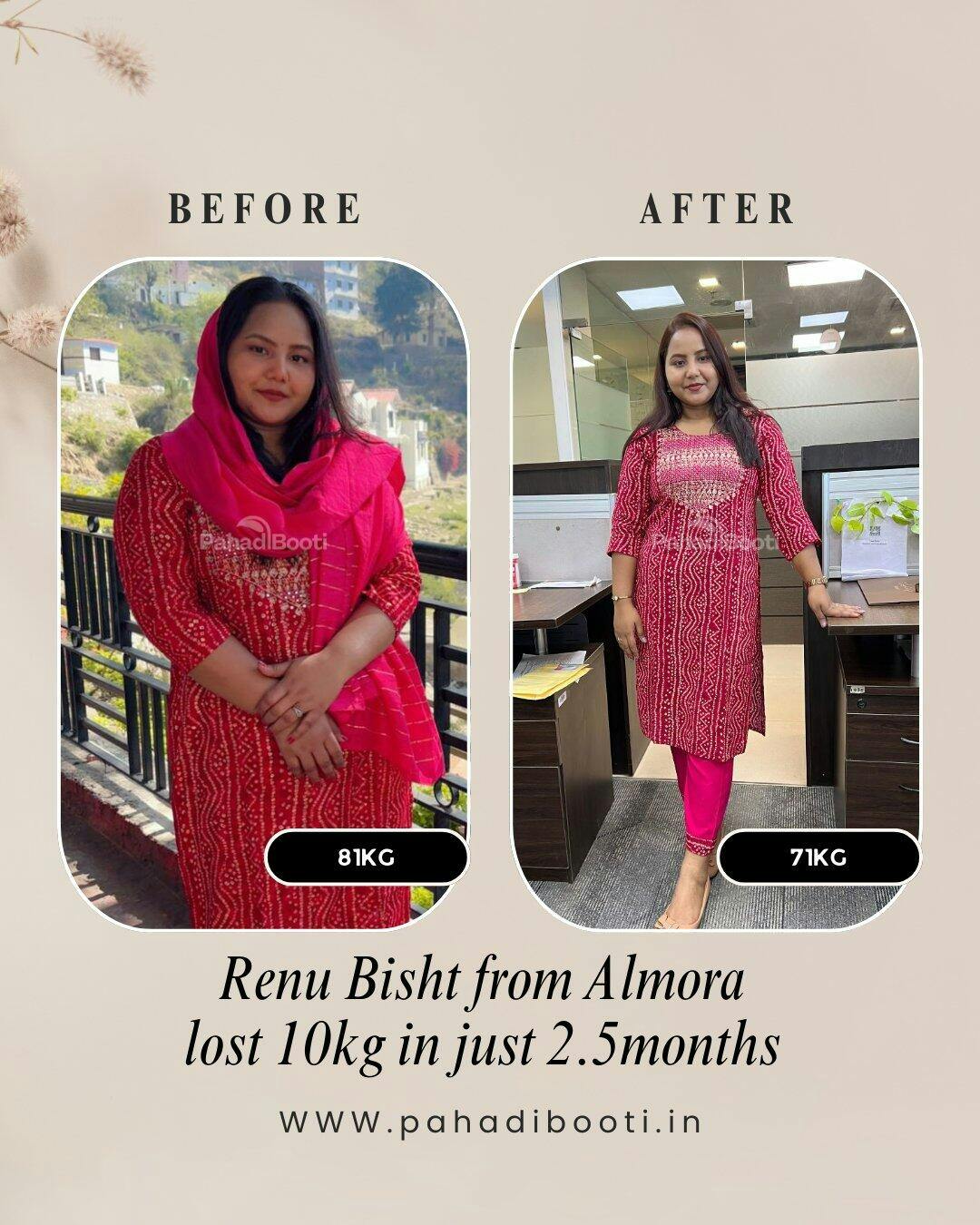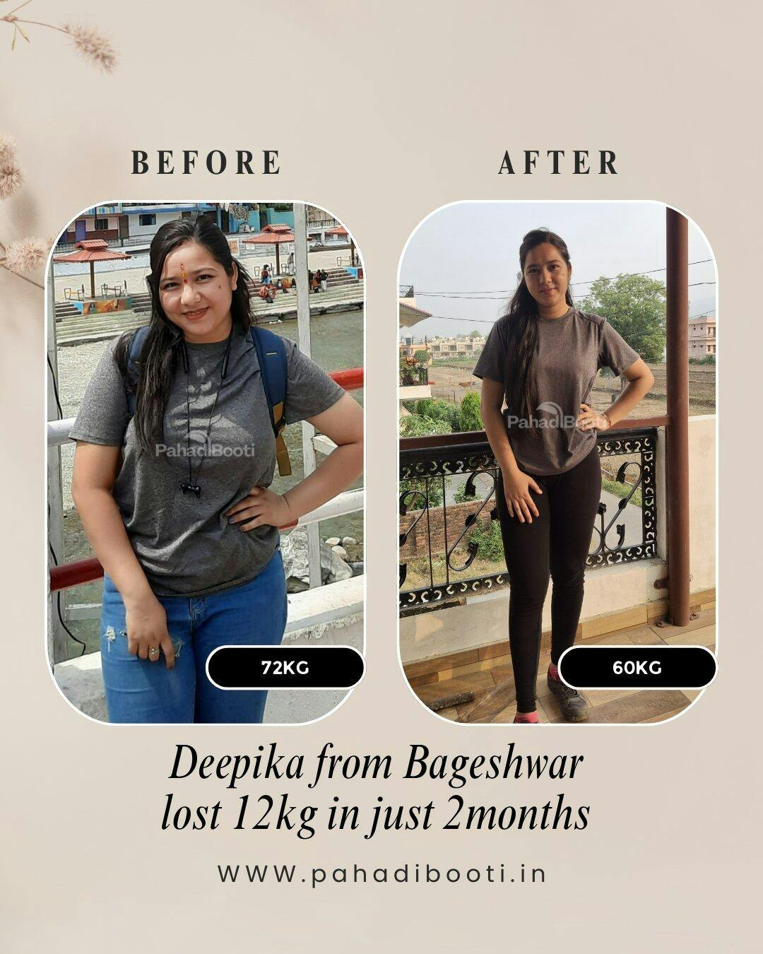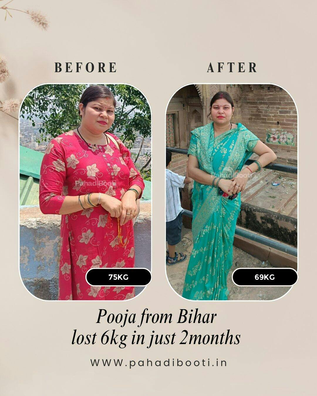मैं पूजा हूँ, बिहार से। मेरा वज़न पहले 75 किलो था और काफ़ी समय से कम करने की कोशिश कर रही थी, लेकिन कोई खास नहीं दिख रहा था। फिर मैंने Pahadi Booti का कोर्स शुरू किया, और धीरे–धीरे करके सिर्फ 2 महीने में मेरा वज़न 69 किलो हो गया।