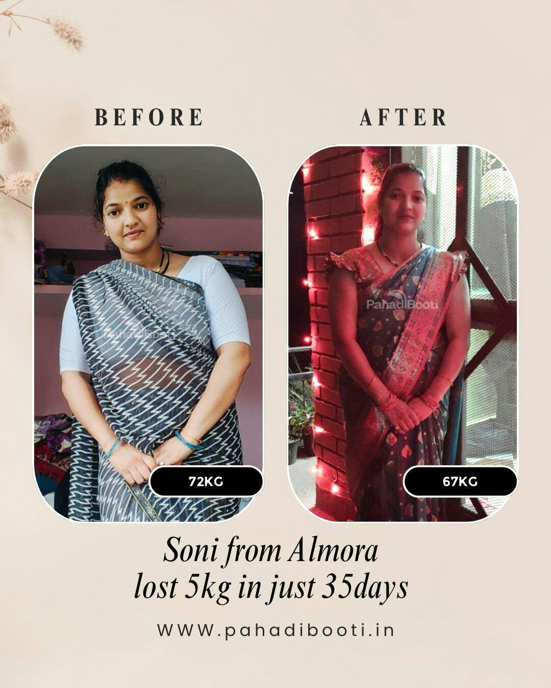 शादी के बाद मेरा वज़न धीरे-धीरे बढ़कर 72 किलो तक पहुँच गया था। घर-काम तो करती थी, लेकिन थकान ज़्यादा रहती थी और चलने-फिरने में भी भारीपन महसूस होता था। फिर मैंने Pahadi Booti का कोर्स शुरू किया। सिर्फ 35 दिनों में मेरा वज़न 67 किलो हो गया।